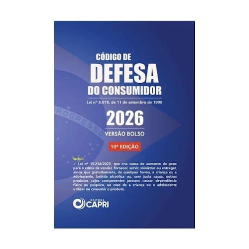A fim de atender ao público interessado em levar o seu manual do Código de Defesa do Consumidor (Lei nº 8.078) para qualquer lugar ou respeitar o layout de sua loja, a Editora Capri lança a versão atualizada de bolso. Inclui a Lei N: 15.234/2025, que cria causa de aumento de pena para o crime de vender, fornecer, servir, ministrar ou entregar, ainda que gratuitamente, de qualquer forma, a criança ou a adolescente, bebida alcoólica ou, sem justa causa, outros produtos cujos componentese possam causar dependência física ou psíquica, no caso de a criança ou o adolescente utilizar ou consumir o produto. Marca: Não Informado