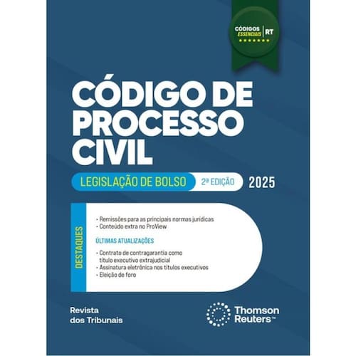 Códigos Essenciais RT - 2025 Conteúdo confiável RT em formato de bolso. Legislação atualizada e com muitas notas remissivas, como só a RT sabe fazer, agora em formato de bolso. Um código leve e fácil de carregar, mas cheio de remissões úteis e com fonte confortável à leitura. Um novo formato, com a praticidade que o seu aluno precisa para complementar os estudos. Além disso, o seu Código vem com um índice remissivo completo e atualizado no ProView. • Indicado para a 2ª Fase do Exame da OAB; • Inclui remissões legislativas que facilitam e complementam os estudos; • Conteúdo extra em ProView • Conteúdo atualizado Destaque Códigos Essenciais RT – Código de Processo Civil • Remissões para as principais normas jurídicas • Conteúdo extra no ProView • Contrato de contragarantia como título executivo extrajudicial • Assinatura eletrônica nos títulos executivos • Eleição de foro