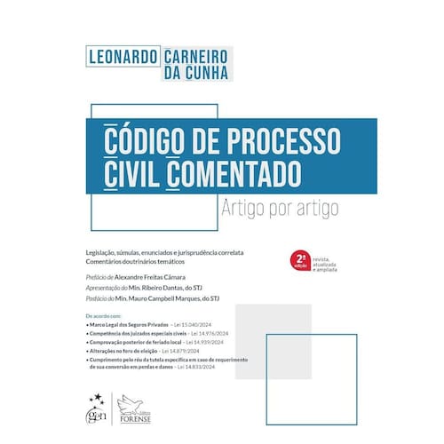 O novo livro do meu amigo Leonardo vem a lume para ser um livro de cabeceira. Daqueles com que todos nós, estudiosos, mas também juristas práticos, que atuamos na Magistratura, na Advocacia (pública ou privada), na Defensoria Pública ou no Ministério Público, nos socorremos sempre que temos uma dúvida. Trata-se de um livro útil. E, se é útil, então é bom. (Do prefácio do Prof. Alexandre Freitas Câmara) Este Código de Processo Civil Comentado possui, entre muitas características que o leitor logo vai perceber, pelo menos dois diferenciais. Em primeiro lugar, é feito por quem participou dos trabalhos de elaboração da lei processual, como integrante da Comissão de Juristas que auxiliou o Parlamento, e, portanto, conhece a norma íntima e profundamente, desde sua fase pré-natal. Em segundo, pelas características que o tornam único entre seus similares e que farão dele, quiçá, o mais útil e prático instrumento para consulta por estudantes e profissionais da área. (Da apresentação do Min. Marcelo Navarro Ribeiro Dantas) Depois de mais de sete anos da entrada em vigor da Lei 13.105/2015, estamos diante de uma obra madura, atualizada e com profundidade de pesquisa, sendo ao mesmo tempo adequada para consultas de toda a comunidade jurídica. (Do posfácio do Min. Mauro Campbell Marques) ?