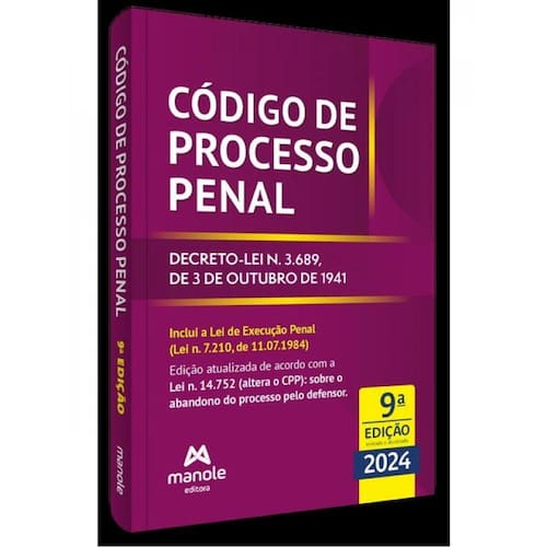 A Editora Manole, prosseguindo com suas publicações jurídicas, apresenta agora seu volume de bolso contendo o Código de Processo Penal (Decreto-lei n. 3.689, de 03.10.1941). Esta edição está atualizada de acordo com a Lei n. 14.752, que altera o CPP nos casos de abandono do processo pelo defensor. Esta edição está atualizada até o dia 19.12.2023, e o leitor poderá manter-se informado sobre as mudanças na legislação até 31.10.2024.