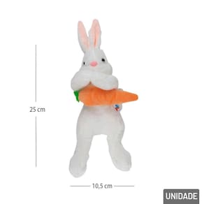 Coelho de Pelúcia Páscoa 25cm com Cenoura Adicione um toque de fofura à sua Páscoa com o encantador Coelho de Pelúcia de Páscoa com Enfeite de Cenoura! Este coelhinho adorável é perfeito para decorar sua casa, presentear alguém especial ou até mesmo para alegrar as brincadeiras das crianças. Com um design delicado e um enfeite de cenoura, ele traz toda a magia da Páscoa para o seu lar.\nCom 25cm de altura, esse coelho de pelúcia tem um visual adorável e meigo, com orelhas, olhos brilhantes e doce que conquistam o coração de todos. O Coelho segura uma linda cenoura de pelúcia, representando o alimento favorito do personagem e adicionando um toque especial à decoração de Páscoa. Com um acabamento de alta qualidade, o coelho possui detalhes caprichados, como seu focinho delicado e a cenoura que ele segura com carinho, tornando o brinquedo ainda mais realista e fofo.\nEspecificações:\nMarca : TINGS\nTipo de material : Poliéster\nCores ou Estampa : Branco, Laranja\nDimensões do Produto : 25 X 10,5 X 12 CM\nDimensões da Embalagem : 25 X 10,5 X 12 CM\nPeso Bruto (Gramas) : 0.113 Marca: Não Informado