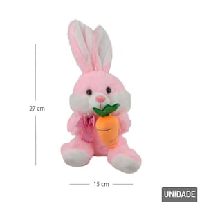 Coelho de Pelúcia Páscoa 27cm Sentado com C Com uma postura encantadora sentada, esse coelhinho traz um olhar meigo e um sorriso doce, ideal para enfeitar qualquer ambiente ou ser o companheiro de abraços das crianças. Para deixar a brincadeira ainda mais temática, o coelho segura uma cenoura de pelúcia, remetendo ao seu alimento favorito e trazendo ainda mais charme ao brinquedo.\nO detalhe do laço elegante no pescoço dá um toque especial e sofisticado, tornando o coelhinho ainda mais encantador. Feito com materiais de alta qualidade, o coelho possui um toque extremamente suave, perfeito para abraços e momentos de carinho. Compacto e fácil de transportar, é perfeito para acompanhar as crianças em qualquer lugar ou para compor uma linda decoração de Páscoa.\nSeja para surpreender alguém especial, decorar cestas de Páscoa ou compor um cantinho aconchegante, esse coelhinho é uma escolha inesquecível. Ideal para enfeitar festas de Páscoa, mesas decorativas e até mesmo o quarto das crianças, trazendo um toque de doçura e alegria.\nDisponível em cores diversas.\nEspecificações:\nMarca : TINGS\nTipo de material : Poliéster\nCores ou Estampa : Color\nDimensões do Produto : 27 X 15 X 12,5 CM\nDimensões da Embalagem : 27 X 15 X 12,5 CM\nPeso Bruto (Gramas) : 0.116 Marca: Não Informado