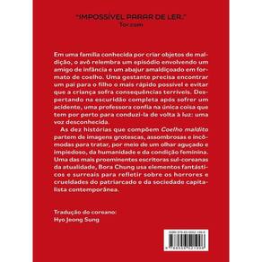 Os contos presentes em Coelho maldito, livro finalista do International Booker Prize, transitam entre realismo mágico, folclore, horror, ficção científica e fantasia, partindo de elementos insólitos para narrar histórias assombrosas que tocam em temas profundamente reais. A coletânea é a primeira obra de Bora Chung, uma das mais notáveis escritoras sul-coreanas da atualidade, publicada fora da Coreia. Em uma família cujos negócios consistem em criar objetos de maldição, o avô relembra um episódio envolvendo um amigo de infância e um abajur amaldiçoado em formato de coelho. Uma gestante precisa encontrar um pai para o filho o mais rápido possível, e evitar que a criança sofra consequências terríveis. Despertando no completo escuro após sofrer um acidente, uma professora confia na única coisa que tem por perto para levá-la de volta à luz: uma voz desconhecida. As dez histórias que compõem Coelho maldito partem de imagens grotescas, assombrosas e incômodas para tratar, por meio de um olhar aguçado e impiedoso, da humanidade e da condição feminina. Uma das mais proeminentes escritoras sul-coreanas da atualidade, Bora Chung usa elementos fantásticos e surreais para refletir sobre os horrores e crueldades do patriarcado e da sociedade capitalista contemporânea. “Com a linguagem concisa e eficaz de Chung, é impossível parar de ler.” — Tor. com