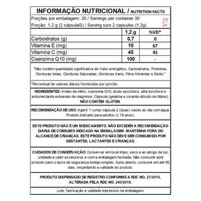 Benefícios - 100mg de coenzima q10 por porção 2 cápsulas ; - pode auxiliar na redução da fadiga muscular; - pode ajudar a desacelerar o envelhecimento da pele; - pode ajudar na melhora do sistema imunológico e no metabolismo celular; - pode ajudar na produção de energia para melhor desempenho durantes as atividades - enriquecida com vitamina e; - enriquecida com vitamina c. - sem glúten.