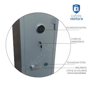 MEDIDAS EXTERNAS: Altura: 130 Centímetros; Largura: 38 Centímetros; Profundidade: 35 Centímetros; MEDIDAS INTERNAS Altura: 127 Centímetros; Largura: 37 Centímetros; Profundidade: 24 Centímetros; PESO 40 kg; Fechadura digital de 04 a 08 digitos com bloqueio após 03 tentativas erradas, chave de emergência, kit de emergência para o caso das pilhas acabarem a carga, e fechadura tipo tetra; Estrutura do cofre: Corpo fabricado em chapa de 1,2mm e porta em chapa 3mm. Porta com 04 travas maciças de 18mm de diâmetro. Pintura em esmalte sintético. Gavetas com fechaduras. O cofre já vai com 04 furos na parte de trás para fixação na parede. Marca: COFRES VENTURA