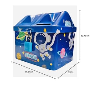 Características: - Material: metal resistente; - Formato: casinha; - Estampa temática de espaço e astronautas; - Acompanha cadeado com chave; - Fácil de abrir e fechar; - Ideal para estimular hábitos de poupança; - Cores: azul com estampas multicoloridas. - Tamanho: 10,5cm de altura x 11,5cm de largura x 9cm de comprimento.