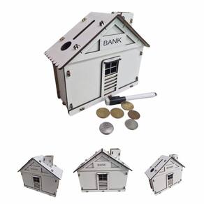 É uma caixa de madeira estilizada e funcional, com design decorativo, usada para armazenar dinheiro de maneira criativa e planejada.