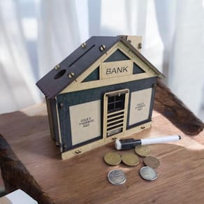 É uma caixa de madeira estilizada e funcional, com design decorativo, usada para armazenar dinheiro de maneira criativa e planejada.
