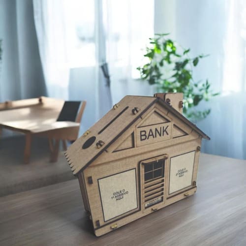 É uma caixa de madeira estilizada e funcional, com design decorativo, usada para armazenar dinheiro de maneira criativa e planejada.