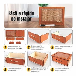 A caixa é feita de madeira de alta qualidade, proporcionando um toque natural e rústico, ao mesmo tempo que mantém uma estética moderna e elegante.