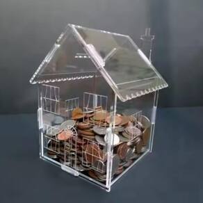 É uma caixa de acrílico estilizada e funcional, com design decorativo, usada para armazenar dinheiro de maneira criativa e planejada.