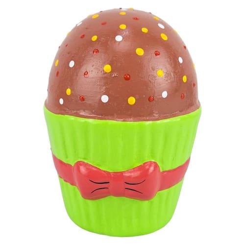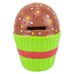 O cofrinho de gesso em formato de cupcake é um objeto decorativo e funcional, com uma aparência realista e atraente. Feito de gesso, tem uma textura suave e é aberto na parte superior para depositar moedas. É perfeito para exibir em uma prateleira ou mesa.