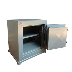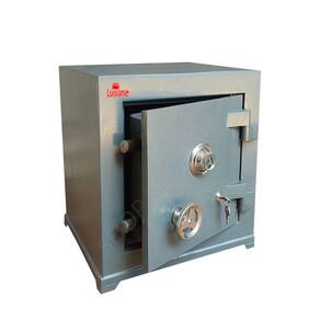 Estrutura do cofre: Corpo fabricado em chapa de 1mm e porta em chapa 2mm. Porta com 02 travas maciças de 18mm de diâmetro. Pintura em esmalte sintético.