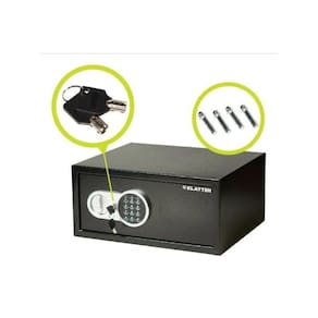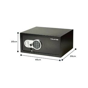 ESPECIFICAÇÕES: Peso : 9,5kg Cor: Preto Material: Ferro Dimensões: 43 comprimento x 35 largura x 20 cm altura Tipo de uso: parede ou piso Capacidade: 22,5 L Espessura das paredes do cofre: 1,5 mm Abertura eletrônica com combinação numérica ajustável Possui chave para abertura em caso de emergência orifício oculto Possui dois orifícios para fixação em parede ou piso contém 2 parafusos Use broca de 15 mm para instalação Interior com acabamento diferenciado carpete Alimentação: 4 pilhas AA não incluídas Origem: China Marca: Klatter