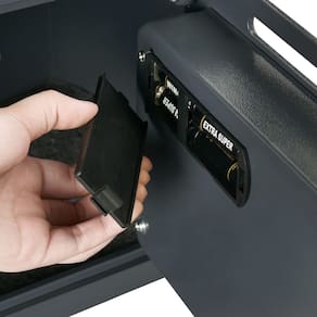 Cofre de segurança eletrônico – Seguro contra quedas com teclado digital e 2 teclas de substituição manual para entrega de dinheiro ou segurança doméstica da Paragon Safes (preto) - Cofre seguro – com um compartimento de entrega de 15 cm de comprimento, você pode manter documentos, envelopes e depósitos em dinheiro seguros com esta caixa de entrega. - Fechaduras SAFEPASSCODE – O cofre possui um teclado LED com códigos de acesso programáveis de 3 a 8 dígitos e 2 teclas de substituição manual para acesso rápido aos seus objetos de valor. - Design seguro e durável – O cofre de depósito é feito com aço calibre 11, dobradiças internas para proteção extra, interior e exterior revestidos com pó, e inclui parafusos de fixação para ancoragem. - Armazenamento seguro de dinheiro – O cofre resistente é feito de aço sólido revestido a pó calibre 11 com dobradiças internas ocultas para segurança extra. Fique tranquilo sabendo que seus valiosos ativos estão trancados com segurança neste cofre de depósito digital. - DETALHES SEGUROS DO PRODUTO - Materiais: Aço revestido com pó. Dimensões seguras: (C) 35,9 cm x (L) 25,4 cm x (A) 25,4 cm; Interior: (C) 34,3 cm x (L) 18,4 cm x (A) 24 cm; Ranhura: (L) 15,2 cm x (A) 1,3 cm. Peso seguro: 10 kg. SAFE4 pilhas AA e parafusos de ancoragem incluídos. Cor segura: cinza escuro