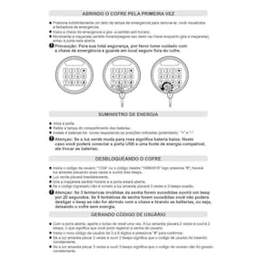 Cofre eletrônico inteligente com luz interna e entrada USB, com chaves codificadas. Construção sólida em aço, proteção ideal contra roubo. Trava unidirecional (20mm). Utilize os furos de fixação da parte de baixo e traseira da caixa-forte para instalá-la em paredes ou em pisos, com os parafusos para montar incluídos. Excelente acabamento em pintura eletrostática em pó (Power Coating). O teclado é bloqueado por 20 segundos se o código é ingressado 3 vezes incorretamente. O teclado é bloqueado por tempo indeterminado se o código é ingressado 6 vezes incorretamente, você não poderá desligar o beep se não for abrindo com as chaves de emergência e tirando as baterias, ou seja, deixando o cofre sem energia. Inclui dois códigos: o código mestre e o código do usuário. Sistema de trava Abra a caixa-forte utilizando um código de 3 a 8 dígitos. O sistema de trava eletrônica está desenvolvido para oferecer um elevado nível de segurança e um fácil modo de operar. Equipado com trava mecânica para abertura de emergência.