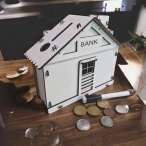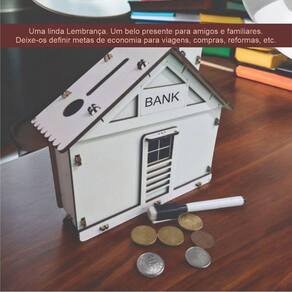 É uma caixa de madeira estilizada e funcional, com design decorativo, usada para armazenar dinheiro de maneira criativa e planejada.