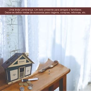 Geralmente, as dimensões da caixa são compactas, facilitando a colocação em ambientes domésticos ou no escritório, ao mesmo tempo que oferece um espaço suficiente para guardar moedas e notas de forma organizada.