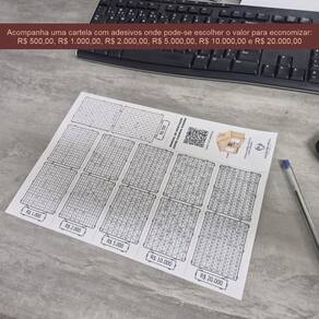 Acompanha cartelas adesivas com o desafio de diversos valores, onde você escolhe o quanto quer poupar