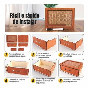 A caixa é feita de madeira de alta qualidade, proporcionando um toque natural e rústico, ao mesmo tempo que mantém uma estética moderna e elegante.