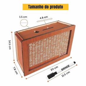 Geralmente, as dimensões da caixa são compactas, facilitando a colocação em ambientes domésticos ou no escritório, ao mesmo tempo que oferece um espaço suficiente para guardar moedas e notas de forma organizada.