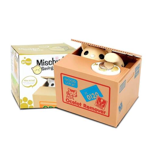 Alimentação: 2 pilhas AA (não inclusas) Material: Plástico + componentes eletrônicos O gatinho recolhe moedas de qualquer tamanho e peso Possui efeitos sonoros Deve ser colocado no pratinho 1 moeda por vez