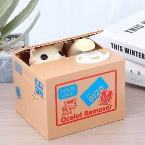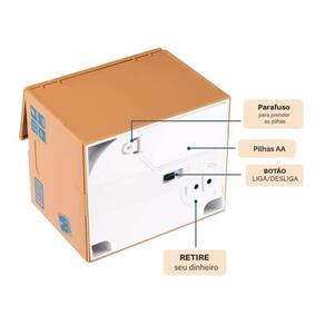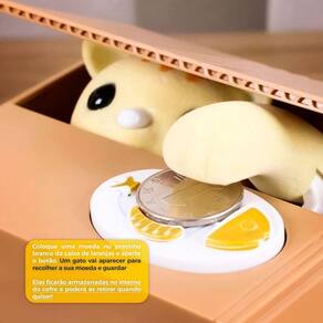 Coloque uma moeda no pratinho branco da caixa de laranjas e aperte o botão. Um gato vai aparecer para recolher a sua moeda e guardar. Elas ficarão armazenadas no interno do cofre e poderá as retirar quando quiser!