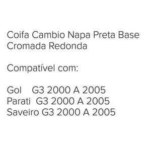 Descrição do produto Mais informações Marca: 60249 Descrição completa Coifa cambio napa preta base cromada redonda Compatível com: Gol g3 2000 a 2005 Parati g3 2000 a 2005 Saveiro g3 2000 a 2005 Cor disponível: Napa preta aro cromado redondo Especificação técnica: Produzido em napa resistente Ótima qualidade e durabilidade Instalação pratica Não acompanha bola de câmbio Importante: recomendamos a instalação por um , pois não nós responsabilizamos pelo mau uso da peça da loja: 3 meses Agradecemos a sua visita Marca: Não Informado Ean: 7898457732833