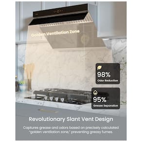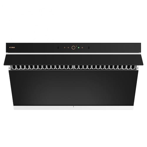 A coifa de embutir sob armário ou parede Fotile JQG9007 de 91 cm na cor preta é indicada para cozinhas residenciais com fogões de 36 polegadas, utilizando desenho de sucção inclinada para aumentar a eficiência de captura de fumaça e vapores na região frontal do fogão. A estrutura combina corpo em aço inoxidável com painel em vidro temperado preto, adequada para instalação sob armário ou diretamente na parede em sistemas de exaustão com duto.