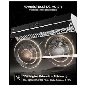 O sistema de ventilação emprega dois motores DC com vazão equivalente de 1100 CFM e pressão estática máxima de 540 Pa, dimensionado para remover fumaça, gordura e odores em diferentes níveis de intensidade de cocção. A coifa oferece quatro velocidades de operação, incluindo modo para frituras com reforço de potência, comandadas por painel touch frontal com temporizador de desligamento automático após alguns minutos.