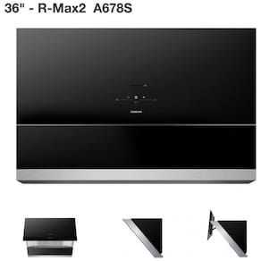 A coifa de embutir sob armário ou parede Robam A678S de 91 cm na cor preta é indicada para cozinhas residenciais com fogões de 36 polegadas, combinando corpo em aço inoxidável 304 com painel frontal inclinado em vidro temperado. O equipamento trabalha em sistema com duto, podendo ser instalado sob armário ou diretamente na parede, oferecendo ampla zona de captação de fumaça ao longo de toda a superfície de cocção.