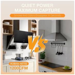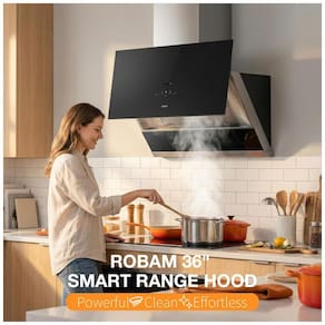 A coifa de embutir sob armário ou parede Robam de 91 cm na cor preta é indicada para cozinhas residenciais com fogões de 36 polegadas, oferecendo exaustão de alto desempenho em sistemas com duto. O equipamento combina corpo em aço inoxidável com painel frontal em vidro temperado, dimensionado para cobrir a área de cocção com ampla zona de captura de fumaça e vapores.