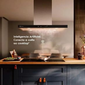 eleve o padrão da sua cozinha com a Coifa de Ilha Electrolux 90cm Inox Experience, equipada com Inteligência Artificial e um poderoso sistema de sucção