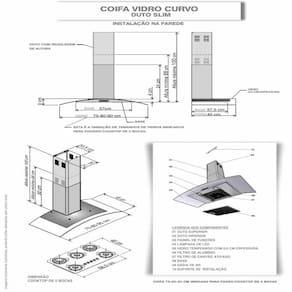 As dimensoes do produto podem sofrer uma pequena variacao de largura do vidro, de ate 7 sete milimetros. Por este motivo, quando a coifa for instalada de forma embutida em nichos, o fabricante recomenda que seja considerada uma folga de pelo menos 1 cm em cada lado