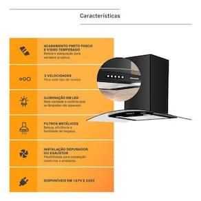 Elegante e funcional, esta coifa de parede de 90 cm e ideal para fogoes de 5 e 6 bocas. Com acabamento preto e painel de vidro, adiciona um toque moderno a cozinha enquanto proporciona eficiencia na eliminacao de fumaca e odores. Opera com tensao eletrica de 127V e potencia de 65 W. Possui tres velocidades ajustaveis, facilitando o controle conforme sua necessidade. Inclui lampadas para melhor visibilidade e filtro de carvao, que auxilia na purificacao do ar. A estrutura combina metal e vidro, recomendando-se limpeza com agua morna, esponja macia e sabao neutro para maior durabilidade. Medidas: 42,6 cm de altura, 89,5 cm de largura e 47 cm de profundidade. Acompanha chamine e oferece 12 meses de contra defeitos de fabricacao. Marca: Não Informado