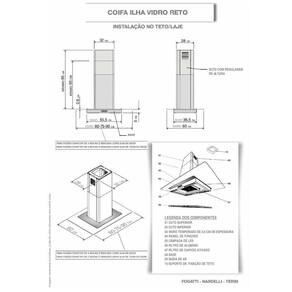 As dimensões do produto podem sofrer uma pequena variação de largura do vidro, de até 7 sete milímetros. Por este motivo, quando a coifa for instalada de forma embutida em nichos, o fabricante recomenda que seja considerada uma folga de pelo menos 1 cm em cada lado