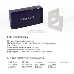 O Coins Holder Autocolante é uma importante ferramenta para armazenar e proteger suas Moedas. É um produto utilizado por colecionadores e coleções de todos os níveis: do iniciante ao avançado. Garante o bom armazenamento e proteção de suas peças.O Coins Holder tem como função proteger sua moeda:- evita o contato com o ambiente externo- evita o manuseio incorreto da peça (sem luvas ou com a mão suja)- facilita a exposição de sua peça na sua coleção- facilita a logística de sua peça, permitindo que você leve em eventos ou para negociar com mais praticidade e proteção- excelente organizador, pois centraliza a moeda no bolso da folha, deixando sua exibição muito mais bonita, organizada e apresentávelNo critério de organização, o Coins Holder se destaca ao promover a padronização da exposição de suas moedas. Tenha uma apresentação muito mais bonita e profissional utilizando Coins Holders.CARACTERÍSTICAS:Modelo: Fixação AutocolanteMaterial: Papel Cartão Branco com Película de PolipropilenoDimensão Cartão Aberto: 10x5cmDimensão Cartão Fechado: 5x5cmDiâmetro deste Anúncio: Ø 20,5mmEmbalagem: Caixa com 30 alvéolos (coins holder)SUGESTÃO DE ARMAZENAMENTO DO COINS HOLDER COM A MOEDAO Coins Holder pode ser armazenado em folhas próprias para coleções de Moedas respeitando o espaço mínimo de 5x5cm cada bolso onde o holder será colocado, caixas organizadoras e separadoras, estojos (cartelas dobráveis) próprios para Coins Holders.COMO UTILIZAR:1- Para utilizá-lo você deve primeiramente dobrar ao meio, na marcação indicada, para facilitar o fechamento com a moeda.2- Em seguida, você deverá posicionar a moeda no centro do Coins Holder, em cima da película de plástico, onde a moeda será exibida. Certifique-se de que sua moeda está perfeitamente alinhada com alguma das laterais do Coins Holder pois após fecha-lo, não conseguirá mais mover a moeda.3- Dobre o coin holder ao meio, por cima da moeda, envolvendo-a completamente até colar. Marca: 3BZN