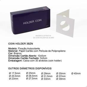 O Coins Holder Autocolante é uma importante ferramenta para armazenar e proteger suas Moedas. É um produto utilizado por colecionadores e coleções de todos os níveis: do iniciante ao avançado. Garante o bom armazenamento e proteção de suas peças.O Coins Holder tem como função proteger sua moeda:- evita o contato com o ambiente externo- evita o manuseio incorreto da peça (sem luvas ou com a mão suja)- facilita a exposição de sua peça na sua coleção- facilita a logística de sua peça, permitindo que você leve em eventos ou para negociar com mais praticidade e proteção- excelente organizador, pois centraliza a moeda no bolso da folha, deixando sua exibição muito mais bonita, organizada e apresentávelNo critério de organização, o Coins Holder se destaca ao promover a padronização da exposição de suas moedas. Tenha uma apresentação muito mais bonita e profissional utilizando Coins Holders.CARACTERÍSTICAS:Modelo: Fixação AutocolanteMaterial: Papel Cartão Branco com Película de PolipropilenoDimensão Cartão Aberto: 10x5cmDimensão Cartão Fechado: 5x5cmDiâmetro deste Anúncio: Ø 37mmEmbalagem: Caixa com 30 alvéolos (coins holder)SUGESTÃO DE ARMAZENAMENTO DO COINS HOLDER COM A MOEDAO Coins Holder pode ser armazenado em folhas próprias para coleções de Moedas respeitando o espaço mínimo de 5x5cm cada bolso onde o holder será colocado, caixas organizadoras e separadoras, estojos (cartelas dobráveis) próprios para Coins Holders.COMO UTILIZAR:1- Para utilizá-lo você deve primeiramente dobrar ao meio, na marcação indicada, para facilitar o fechamento com a moeda.2- Em seguida, você deverá posicionar a moeda no centro do Coins Holder, em cima da película de plástico, onde a moeda será exibida. Certifique-se de que sua moeda está perfeitamente alinhada com alguma das laterais do Coins Holder pois após fecha-lo, não conseguirá mais mover a moeda.3- Dobre o coin holder ao meio, por cima da moeda, envolvendo-a completamente até colar. Marca: 3BZN