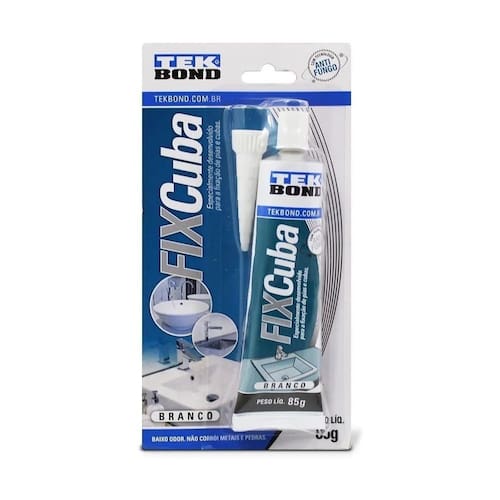 Especificações técnicas: - fabricante: tek bond; - linha: fixcuba; - cor: branca; - peso líquido: 85g; - desenvolvido para fixar e colar cubas e pias; - possui propriedades anti-fungo; - temperatura para aplicação: 5°c até 45°c; - tempo de formação de película: 20 a 60 minutos; - tempo de cura total: 24 a 48 horas; - resistente a água e aos raios ultravioletas; - acompanha bico dosador, para facilitar a aplicação. Instruções de uso: 1º. As superfícies de aplicação devem ser limpas com álcool ou acetona, secas e firmes. Não utilizar querosene ou gasolina para a limpeza das superfícies. 2º. Cortar a ponta do cartucho e cortar o bico aplicador em um ângulo de 45º no tamanho e espessura desejada. Rosquear o bico no cartucho aplicador e colocar na ferramenta de aplicação aplicadora. 3º. Aplique o adesivo em forma de filetes; 4º. Durante a colagem orientamos a colocação de grampos ou ganchos para que não haja a movimentação da cuba ou peça a ser colada. 5º. Se as peças forem pesadas, utilizar um suporte fita adesiva, calço, etc. até a secagem total do adesivo. 6º. A cura total é de 24 horas a 48 horas em função do clima, quantidade de adesivo e peso das peças a serem fixadas. Atenção: - não deve ser aplicado em espuma de poliestireno e, em plásticos: polietileno, polipropileno e teflon; - para superfícies que tenham contato direto com alimentos; - não aceita pintura; - não pode ser utilizado como adesivo estrutural. Aplicação: - é amplamente utilizado no mercado de construção e decoração, pois adere também vários tipos de materiais, como vidro, cerâmica, madeira, alumínio, concreto, mármore, cimento e etc. .