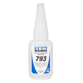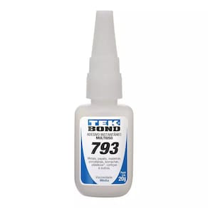 Cola Adesiva Instantânea Tekbond 793 20G O adesivo TEKBOND - 793 é um adesivo a base de cianoacrilato de média viscosidade desenvolvido para colagens que necessitam de alta velocidade de cura em substratos de difícil adesão principalmente para materiais porosos. Adere diversos tipos de materiais, como compostos de borracha, EPDM, borracha nitrílica, neoprene, EVA e Viton. É um produto monocomponente e não requer mistura. O processo de cura inicia-se quando uma fina camada de adesivo é aplicada entre as superfícies entrando em contato com a umidade do ar atmosférico. É um adesivo multiuso, muito utilizado no setor moveleiro e no setor industrial. Aplicação: Adere diversos tipos de materiais, como compostos de borracha, EPDM, Borracha nitrílica, neoprene, EVA e Viton. Mas é um adesivo multiuso, muito utilizado no setor moveleiro e no setor industrial. Características: É um produto monocomponente e não requer mistura. O processo de cura inicia-se quando uma fina camada de adesivo é aplicada Entre as superfícies entrando em contato com a umidade do ar atmosférico. Modo de Uso: Para obter um resultado satisfatório, as superfícies devem estar limpas, Isentas de óleo e sujeira. Deve-se aplicar uma camada fina de adesivo em apenas 1 um dos Substratos a serem colados, pois o excesso prejudica o bom Desempenho da colagem. Após a aplicação do adesivo, é preciso manter as peças pressionadas por Aproximadamente 20 segundos, quando a cura inicial estará concluída E a peça poderá ser manuseada com segurança. A cura total ocorrerá em 24 horas. Este adesivo é indicado para folgas de até 0,10mm. Precauções: O excesso de cola prejudica a colagem. Cola a pele e olhos em pouco segundos. Mantenha fora do alcance das crianças. DADOS TÉCNICOS: Viscosidade cP : 80 a 120 Temperatura de Trabalho ºC : -55 a 80 Preenchimento de Folgas mm : Até 0,10 Resistência ao Cisalhamento Aço x Aço : 100Kgf/cm2 Ean: 7909463220778