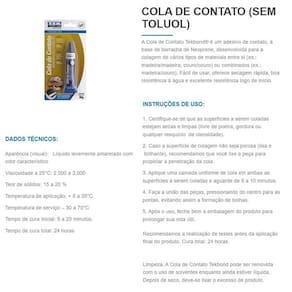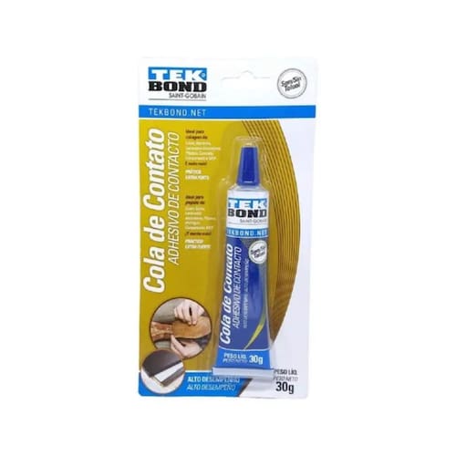 A COLA DE CONTATO TEKBOND 30 GR é um adesivo a base de borracha de Neoprene, desenvolvido para colagens de alto desempenho em diferentes materiais, entre si e combinados em diversos tipos de aplicações. É um adesivo de uso geral, pode ser utilizado na colagem de couro, tecidos, fibras, tapeçaria de automóveis, madeira, papelão, carpetes, etc. Não adere materiais a base de polipropileno, Polietileno e Teflon.