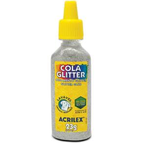 Cola Com Glitter Tubo 23G. Prata Cola Glitter Acrilex Foi desenvolvida para trabalhos escolares e artesanais. Perfeita para atividades de desenvolvimento artístico. Possui um exclusivo bico aplicador que facilita a pintura, podendo ser Utilizado também com esponja ou pincel, para fazer colagens, decorar e pintar sobre papel, papel cartão e cartolina. Não é tóxica, lavável e possui brilho intenso