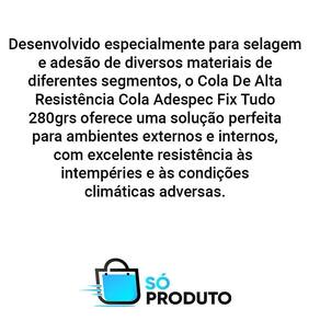 DescriçãoDesenvolvido especialmente para selagem e adesão de diversos materiais de diferentes segmentos, o cola de alta resistência cola adespec fix tudo 280grs oferece uma solução perfeita para aplicações em ambientes externos e internos, com excelente resistência às intempéries e às condições climáticas adversas.DetalhesÉ um selante adesivo monocomponente de alta tecnologia que cura através da umidade do ar formando um elastômero de alta resistência.EspecificaçõesMarca pesiloxContém 1 cartucho de 280gCor transparenteAdesão facilmente em materiais como borracha, vidro, cobre, alumínio, alo e a maioria dos plásticos. Aceita adesões como vidro com alumínio ou borracha com metal. Ideal para vedações e colagens de substratos. Pode ser aplicado para vedação de box, pias, encanamentos e esquadrias ou selagem de juntas de conexões metálicas.Validade: 12 mesesCaracterísticasPossui uma longa vida útil e é extremamente fácil de aplicar, garantindo um resultado perfeito em todas as superfícies.As imagens são meramente ilustrativas Marca: Pesilox