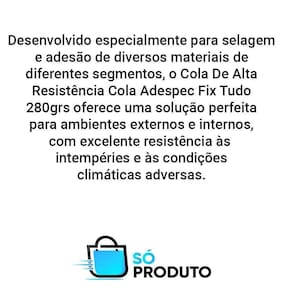 Descrição Desenvolvido especialmente para selagem e adesão de diversos materiais de diferentes segmentos, o cola de alta resistência cola adespec fix tudo 280grs oferece uma solução perfeita para aplicações em ambientes externos e internos, com excelente resistência às intempéries e às condições climáticas adversas.