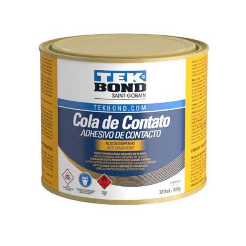 Cola de contato adesivo tekbond 380ml / 400g madeira Vendido por ferramentas e gabaritos Descrição: A cola de contato é um adesivo a base de borracha de neoprene, desenvolvido para colagens de alto desempenho em diferentes materiais, entre si e combinado sem diversos tipos de aplicações. É um adesivo de uso geral, pode ser utilizado na colagem de couro, tecidos, fibras, tapeçaria de automóveis, madeira, papelão, carpetes, etc. Não adere materiais a base de polipropileno, polietileno e teflon. Instruções de uso e manuseio: - agite bem antes de usar. As superfícies a serem coladas devem estar limpas, secas e livres e oleosidade e gorduras. Superfícies porosas devem ser lixadas antes da aplicação do adesivo. - faça um teste preliminar com o material desejado para determinar a quantidade necessária de adesivos e compatibilidade de substratos. - aplique uma camada de cola em ambas as superfícies. Aguarde a secagem 5 a 10 min . - monte as peças, exercendo pressão do centro para as bordas, evitando a formação de bolhas. - temperatura recomendada para a aplicação: entre 18ºc e 25ºc. - para manuseio do produto, recomenda-se a utilização de epis. Para maiores informações de segurança, consultar a fispq do produto. Limitações de uso: A cola de contato tekbond não é indicada para as seguintes situações: - para as superfícies que estejam com contato direto dos alimentos. - não recomendado para aplicações de imersão contínua em água. - não recomendado para uso em juntas abaixo do solo ou trafegáveis. Especificações: - base química: adesivo a base de neoprene - aparência visual : líquido levemente amarelado - viscosidade a 25 ºc: 2.000 a 3.000 cps - densidade a 25 ºc: 0,8 a 1,0 g/ml - teor de sólidos: 15 a 20 % - temperatura de aplicação: 5 a 35 ºc - temperatura de operação: - 30 a 70 ºc - tempo de cura inicial: 5 a 20 minutos - tempo de cura total: 24 horas - tempo de armazenamento à 20ºc: 12 meses Ean: 7898543383598