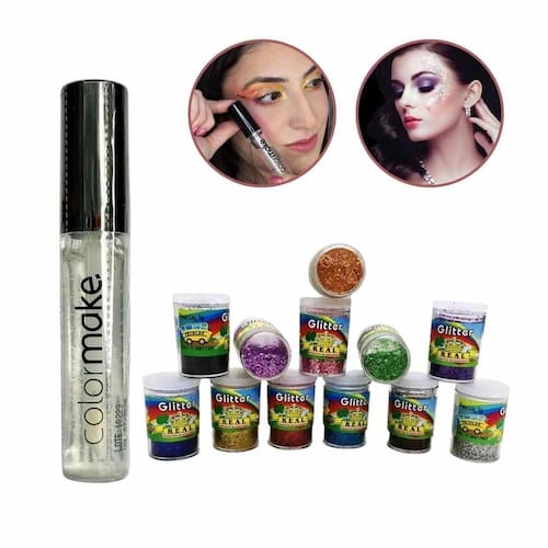 cola para glitter líquida 6ml incolor maquiagem artistica e glitter cores. Cola e glitter, para fazer aquele make incrível. A cola tem fórmula leve e incolor desenvolvida para proporcionar brilho intenso, longa duração e secagem rápida, sem causar o indesejado efeito craquelado. Isso permite que você alcance um resultado surpreendente em sua make, fácil aplicação, após aplicação use glitters para dar brilho e beleza em sua maquiagem. O kit contém: 1 cola de 6ml. 12 potes de glitter 3g cada cores. Modo de uso com auxílio do aplicador, coloque uma pequena quantidade do fixador sobre a ele, deposite o glitter e espere secar. Precauções: não ingerir, manter fora do alcance de crianças, não aplicar sobre a pele irritada ou lesionada. Ao sinal de qualquer irritação suspender o uso do produto. Como remover demaquilante.