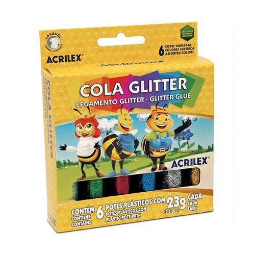 Cola Glitter Acrilex, é ideal para atividades de desenvolvimento artístico, possui um exclusivo bico aplicador que facilita a pintura, podendo ser usada também com esponja ou pincel sobre papel, papel cartão e cartolina. Sua embalagem contém 6 bisnagas de 23 g nas cores: Cristal, verde, vermelho, azul, prata e ouro.