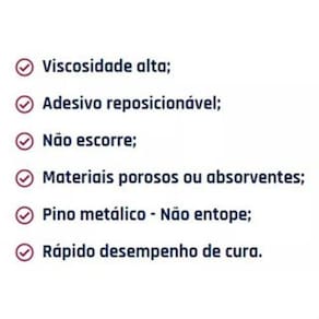 Viscosidade alta; Adesivo reposicionável; Não escorre; Materiais porosos ou absorventes; Pino metálico - não entope; Rápido desempenho de cura.