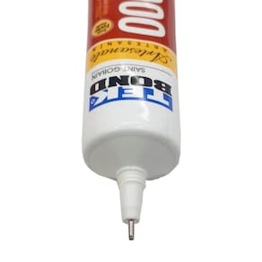 6. Para evitar entupimentos, após a utilização, remova o excesso de adesivo do bico com acetona. O adesivo curado pode ser removido por corte ou raspagem.