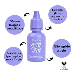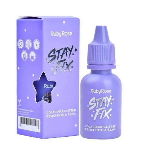 A cola para glitter Stay Fix Ruby Rose é um produto inovador que oferece fixação e durabilidade para o seu glitter. Com ela, é possível criar looks incríveis com glitter que duram o dia todo. Quando aplicada deixa a região resistente à água, lágrima, suor e fricção. Potente para colar glitter, pigmento e sombra. Não testado em animais. 100% Livre de parabenos. Testado dermatologicamente. Embalagem reciclável.